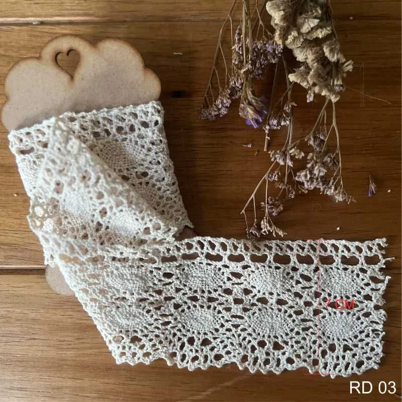 Renda 100% algodão na cor cru, com 7 cm de altura. Vendida por metro. Ideal para detalhes delicados em peças artesanais e trabalhos manuais como panos de copa e aventais.